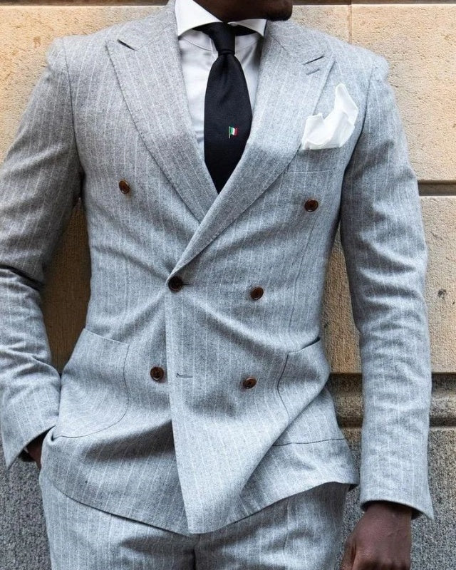Ahem Gray Striped Double Breasted Peaked Lapel Prom Men Suits