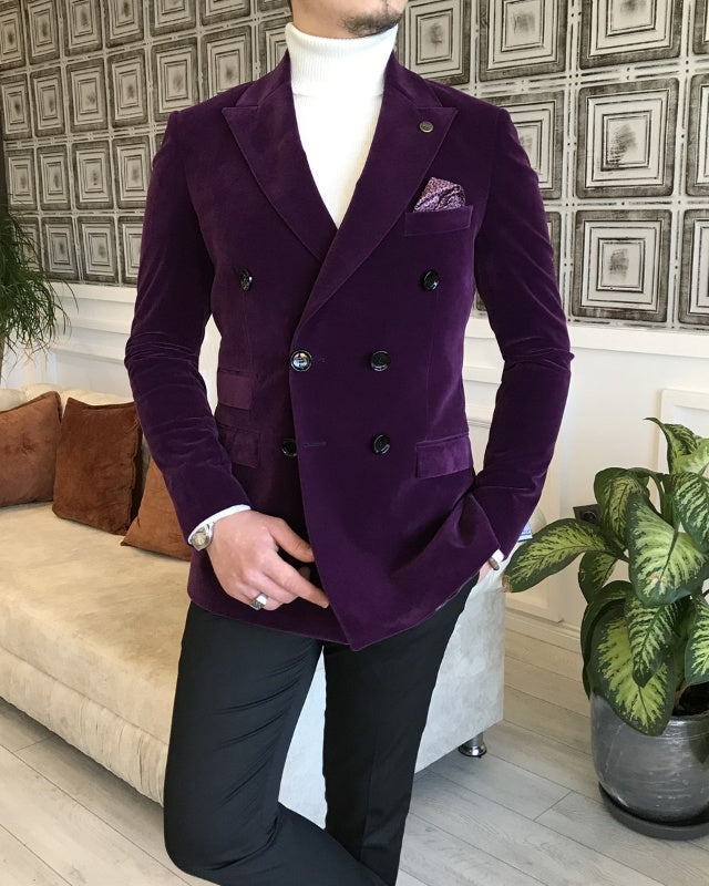 Purple Velvet Double Breasted Peaked Lapel Slim Fit Prom Men Suits