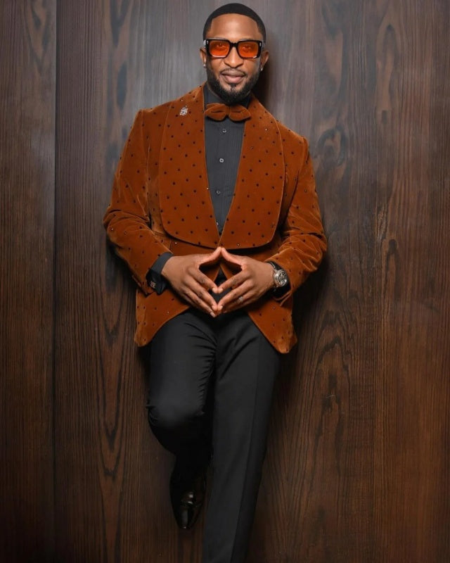 Young Caramel Shawl Lapel Velvet Prom Suits With Beading